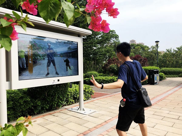 了解了南翠屏公園的整體規劃和布局,接下來進入我們今天的主題,南翠屏公園的AR太極。AR太極設備把太極拳和AR技術相結合,實現面對面教學。市民、游客可跟隨畫面指引體驗太極招式。AR會自動識別市民、游客動作,并打出分數,讓大家聯系太極拳的動作規范,進而實現強身健體的目的。做得好的體驗者還可觸發系統自行拍照并生成二維碼,留存和分享自己的照片。AR太極設備讓每一位來這里游玩的公眾都忍不住來體驗一把這個“新奇的大家伙”。