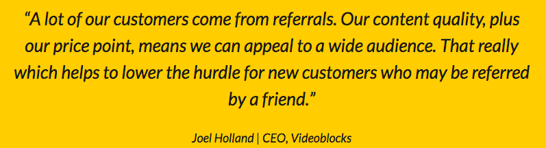 制作一支原生影片所使用到的素材可能會非常昂貴,但是Video Block 顛覆了業界的常規,它提供影片素材,從短片、背景、特殊效果、甚至到AfterEffects 范本等,不論每個月下載多少內容,都均一收費,但現在Referral Program 并沒有直接在網站上揭露。不過根據 Video Block 的 CEO 的引言,推薦營銷的策略的確讓他們更不費力地招來更多許多新客戶,而 Refferral Candy 的個案研究也顯示出 Video Blocks 透過推薦營銷賺進 10 萬美元。
